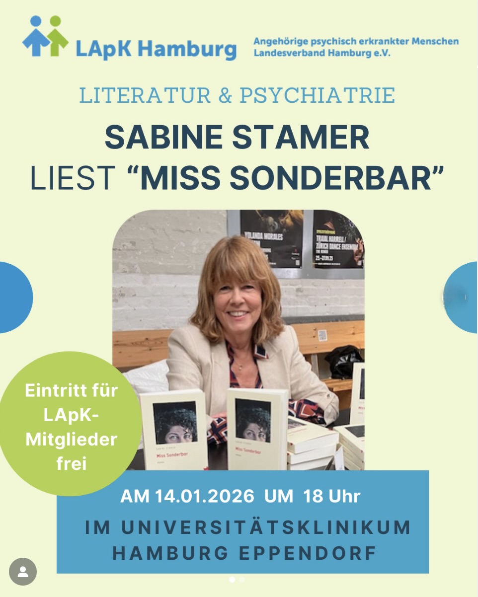 📅 Dienstag, 14. Januar 2026 🕕 Beginn: 18:00 Uhr 📍 Universitätsklinikum Hamburg-Eppendorf (UKE) Martinistraße 52, 20246 Hamburg Gebäude N55, Raum SR 210/211 Im Rahmen der Veranstaltungsreihe „Literatur & Psychiatrie“ liest Sabine Stamer aus ihrem Roman „Miss...
